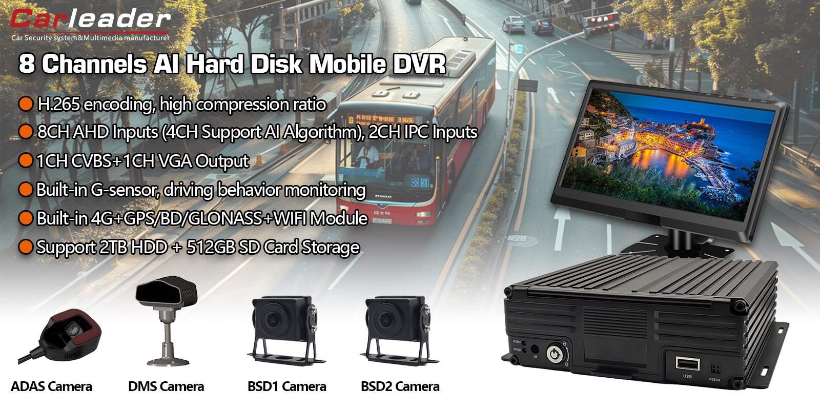 Carleader8CH AI HDD Mobile DVR Υποστήριξη ADAS+DMS+BSDείναι η τέλεια λύση για εμπορικούς στόλους, δημόσια μέσα μεταφοράς, logistics και ειδικά οχήματα που απαιτούν:
