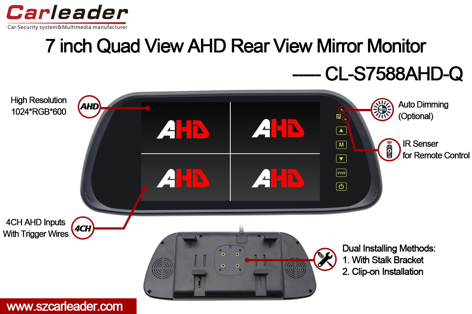 Αναβάθμιση στοCarleaderΟθόνη καθρέφτη οπισθοπορείας 7 ιντσών 4CH Quad AHD Υποστήριξη Διπλής εγκατάστασηςγια απαράμιλλη ορατότητα, αξιοπιστία και ηρεμία στο δρόμο.