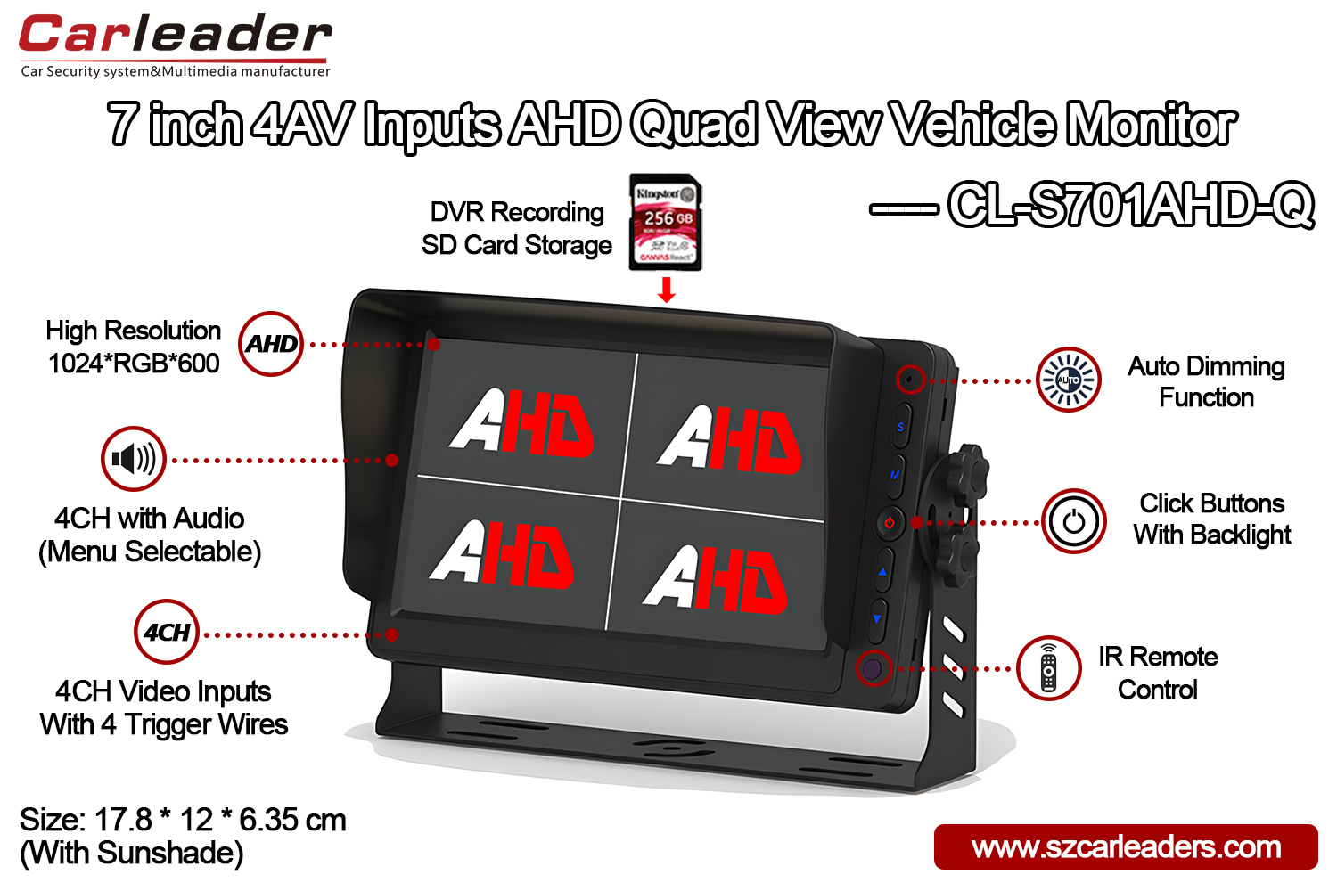 Είσοδοι 4CH AHD Carleader 7 ιντσών Η οθόνη τετραπλής προβολής υποστηρίζει λειτουργία εγγραφής DVR, με υποδοχή κάρτας SD στο πίσω μέρος της οθόνης, η μέγιστη χωρητικότητα είναι έως 256 GB. Δυνατότητες με λειτουργία εγγραφής βρόχου, μπορούν να εγγράψουν αυτόματα το βίντεο της κάμερας και την αναπαραγωγή.
