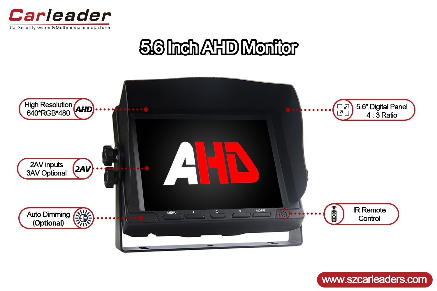 CarleaderΕφεδρική οθόνη οχήματος 5,6 ιντσών 2CH AHD εισόδουςιδανικό για φορτηγά, λεωφορεία, RV και κάθε όχημα όπου η βελτιωμένη ορατότητα πίσω και η ασφάλεια αποτελούν προτεραιότητα. Η ανθεκτική του κατασκευή, η καθαρή οθόνη και τα πρακτικά χαρακτηριστικά του το καθιστούν αξιόπιστο εξάρτημα για σύγχρονα συστήματα κάμερας οχημάτων.