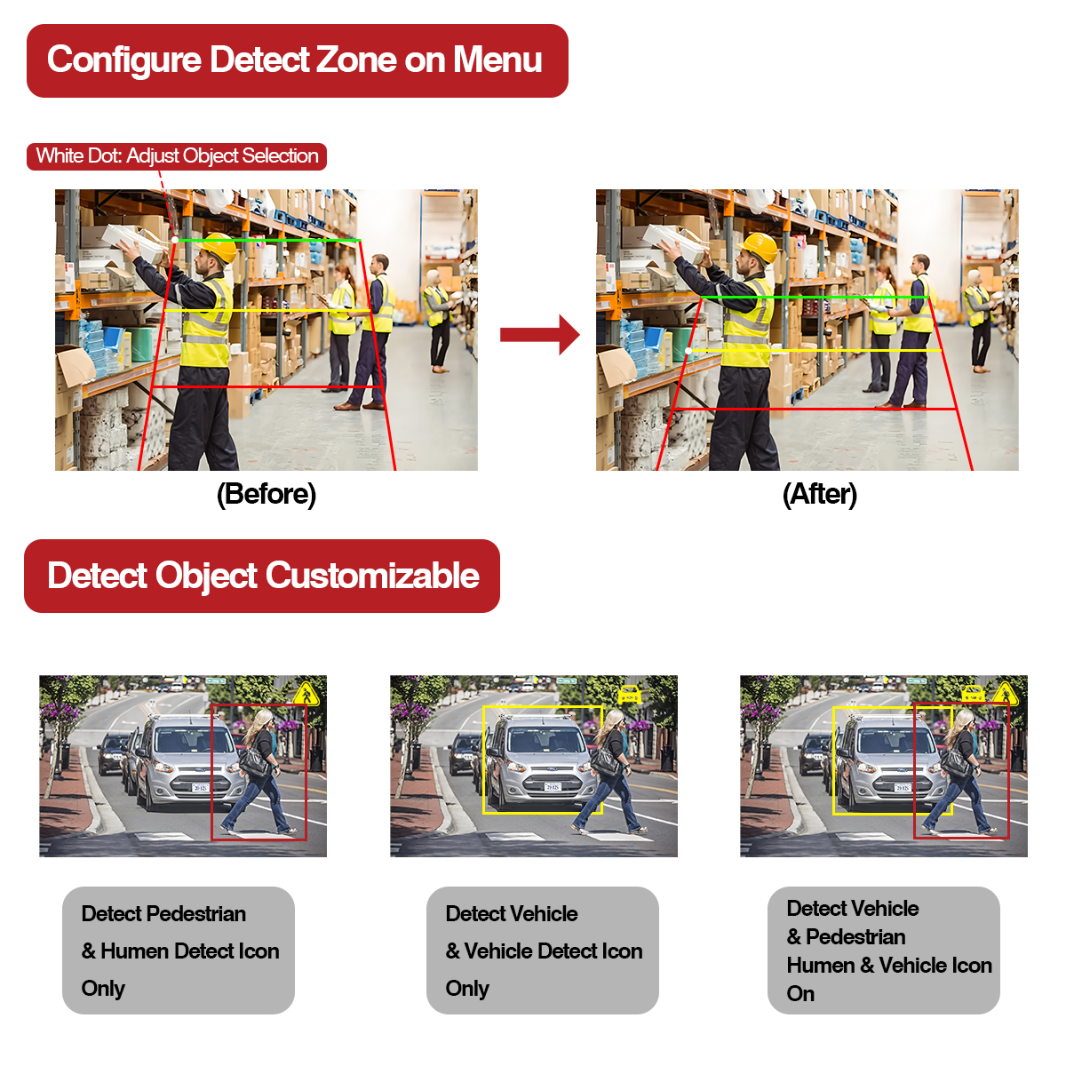 Αυτή η κάμερα AI με ενσωματωμένη λειτουργία προειδοποιητικού φωτός, το χρώμα του φωτός θα αλλάξει στο αντίστοιχο χρώμα όταν το αντικείμενο ανίχνευσης εισέλθει σε διαφορετική περιοχή ανίχνευσης (Κόκκινο, Κίτρινο, Πράσινο). Ενσωματώστε επίσης με συναγερμό σε συναγερμό γύρω από πεζούς και όχημα που πλησιάζουν στο όχημά σας.