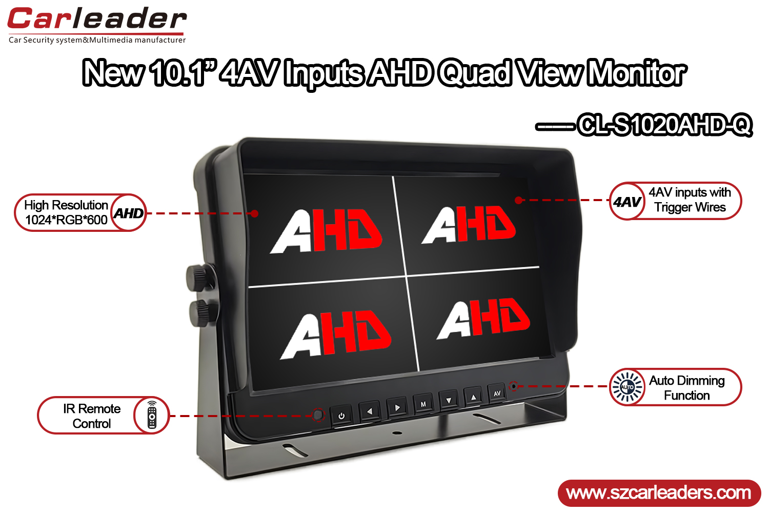 CarleaderΟθόνη AHD βαρέως τύπου οχήματος 10,1 ιντσών τετραπλής οθόνης 4CHείναι μια οθόνη Quad AHD υψηλής απόδοσης 10,1 ιντσών σχεδιασμένη για αξιόπιστη και ευέλικτη πολυκαναλική παρακολούθηση βίντεο. Διαθέτοντας ένα μεγάλο ψηφιακό πάνελ με ανάλυση 1024xRGBx600 και φωτεινότητα 550 cd/m², προσφέρει καθαρές, ζωντανές εικόνες ακόμα και σε δύσκολες συνθήκες φωτισμού.