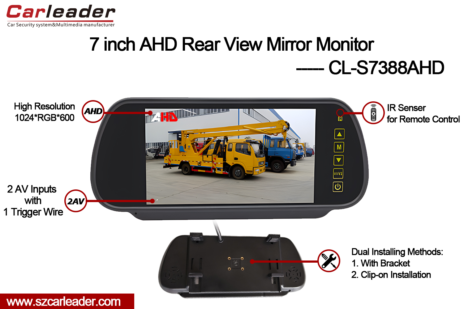CarleaderΟθόνη AHD με καθρέφτη πίσω όψης LCD TFT 7 ιντσώνείναι μια οθόνη AHD καθρέφτη αυτοκινήτου 7 ιντσών υψηλής απόδοσης που έχει σχεδιαστεί για να προσφέρει εξαιρετική ευκρίνεια και ευελιξία για σύγχρονα συστήματα παρακολούθησης οχημάτων. Συνδυάζοντας προηγμένα χαρακτηριστικά με φιλική προς το χρήστη σχεδιασμό, αυτή η οθόνη εξασφαλίζει αξιόπιστη απόδοση σε διαφορετικές συνθήκες οδήγησης.