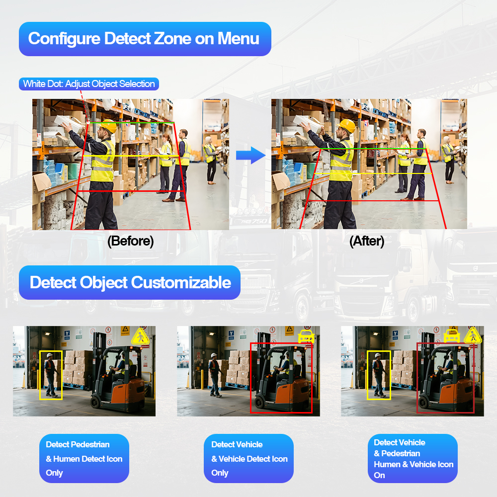 AI-Powered Detection: Ο προηγμένος αλγόριθμος AI προσδιορίζει με ακρίβεια τους πεζούς και τα οχήματα σε πραγματικό χρόνο, διασφαλίζοντας προληπτική ασφάλεια για επαγγελματικά οχήματα, βαρέα μηχανήματα και λειτουργίες στόλου.
